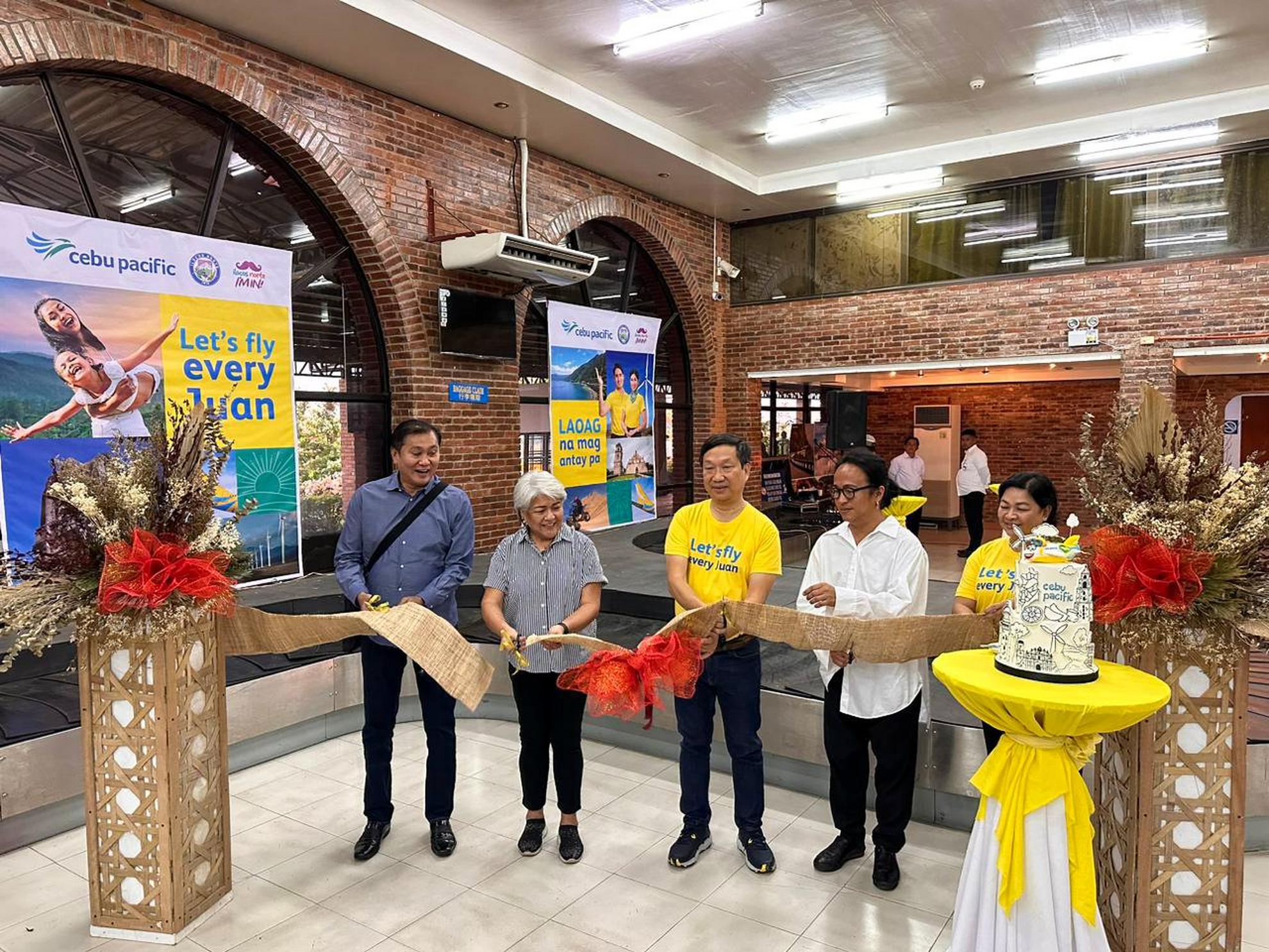 L-R: Metro Ilocos Norte Council General Manager Perry Martinez, Ilocos Norte Vice Governor Cecilia Araneta-Marcos, Cebu Pacific Chief Corporate Affairs Officer Michael Ivan Shau, Ilocos Norte Tourism Office Head Aian Raquel, and Cebu Pacific Director for Passenger Sales and Distribution Arlene Tena lead the ribbon cutting to formally inaugurate the airline’s Laoag-Manila route. (Photo courtesy of the Provincial Government of Ilocos Norte)